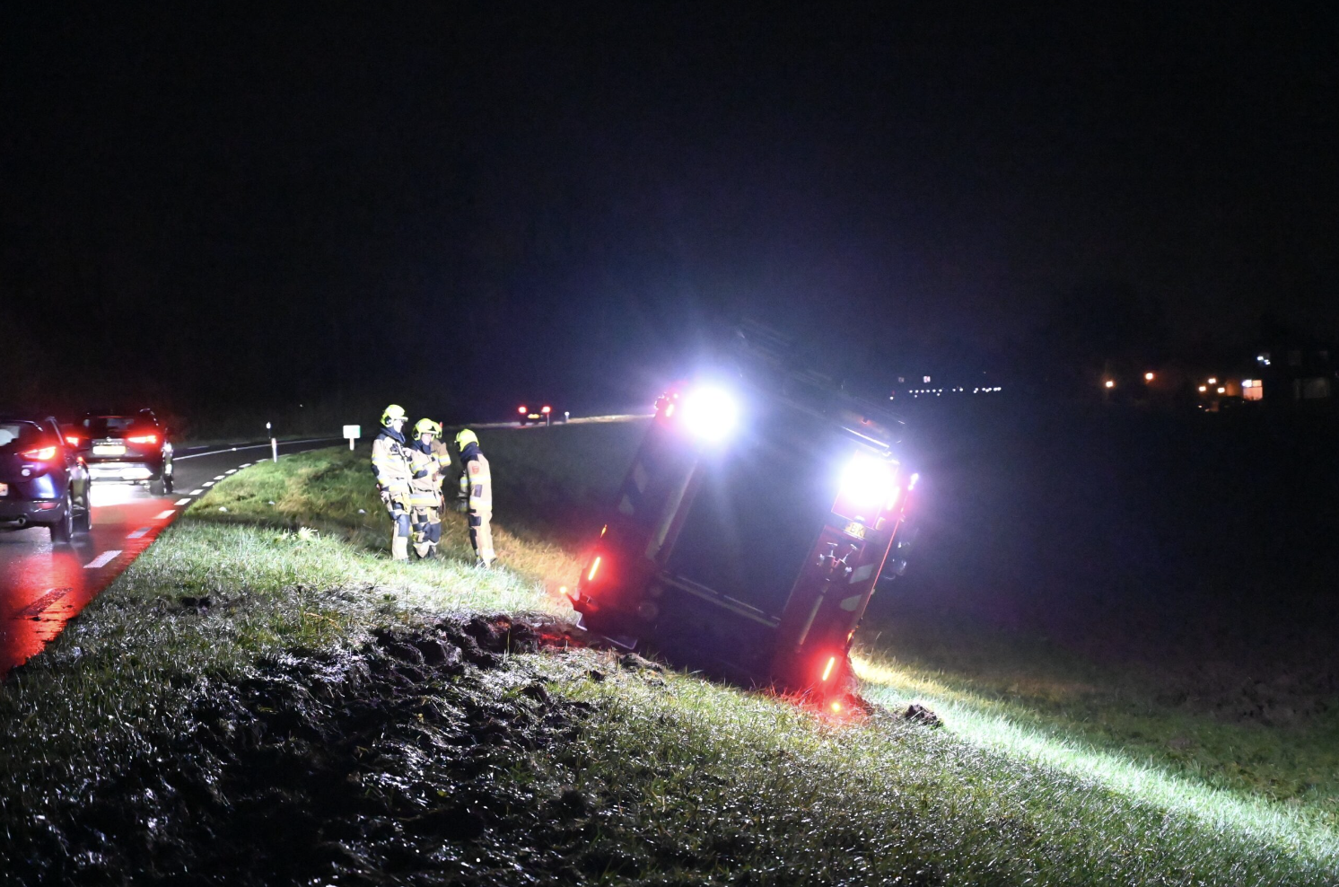 De brandweerwagen zit vol met water en er wordt een groot bergingsvoertuig ingezet om de brandweerwagen uit het weiland te halen.