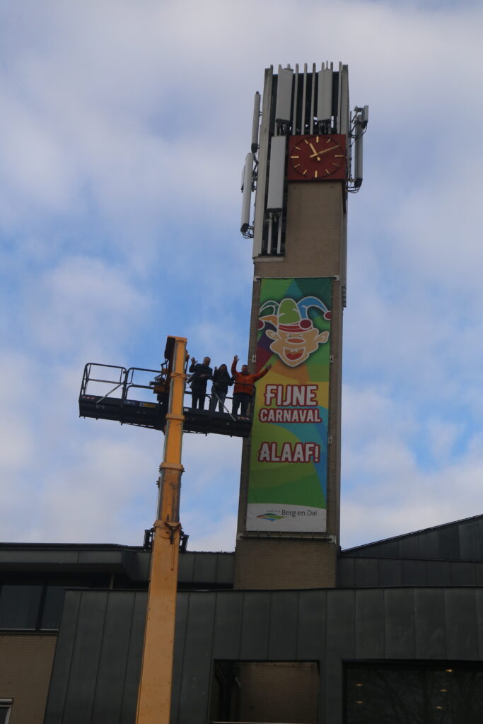 Carnavalsdoek ‘De Lange Pier’ hangt weer aan het gemeentehuis van Berg en Dal