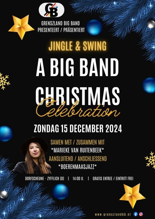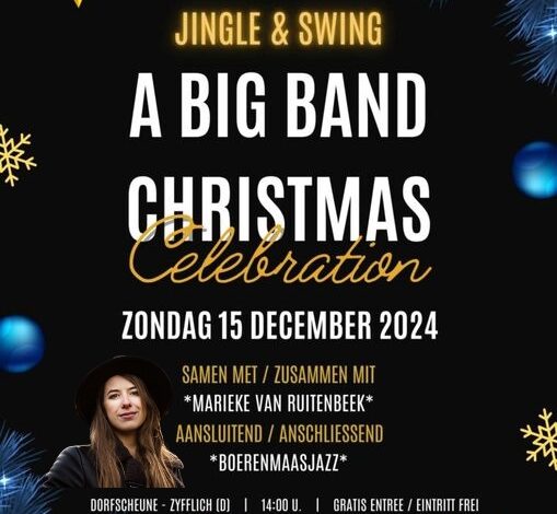 ZYFLICH >> Dit jaar brengen wij opnieuw een sfeervolle, swingende kerst in Zyfflich! Op zondag 15 december verzorgt de Grenz(s)land Bigband een kerstconcert in de Dorfscheune, gelegen tegenover de kerk in Zyfflich. Na het concert zorgt BoerenMaasjazz voor muzikale begeleiding tijdens de borrel. Marieke van Ruitenbeek zal bij beide optredens haar zangtalent laten horen en het publiek meenemen in de kerstsfeer.